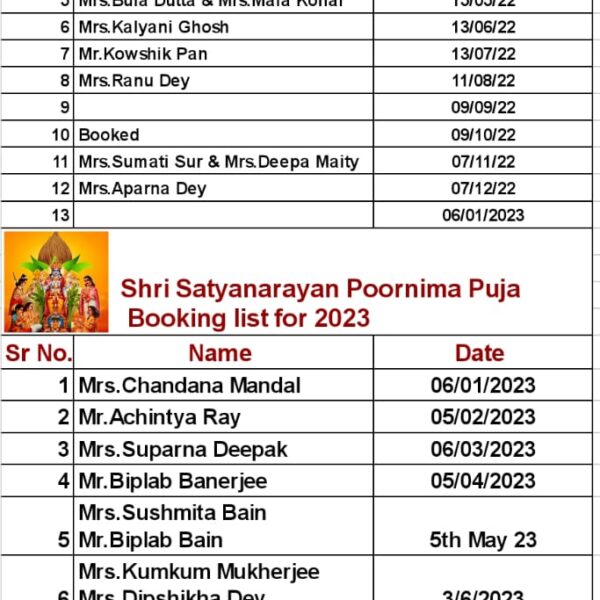 Amavasya Pooja Booking List & Satyanarayan Pooja Booking List